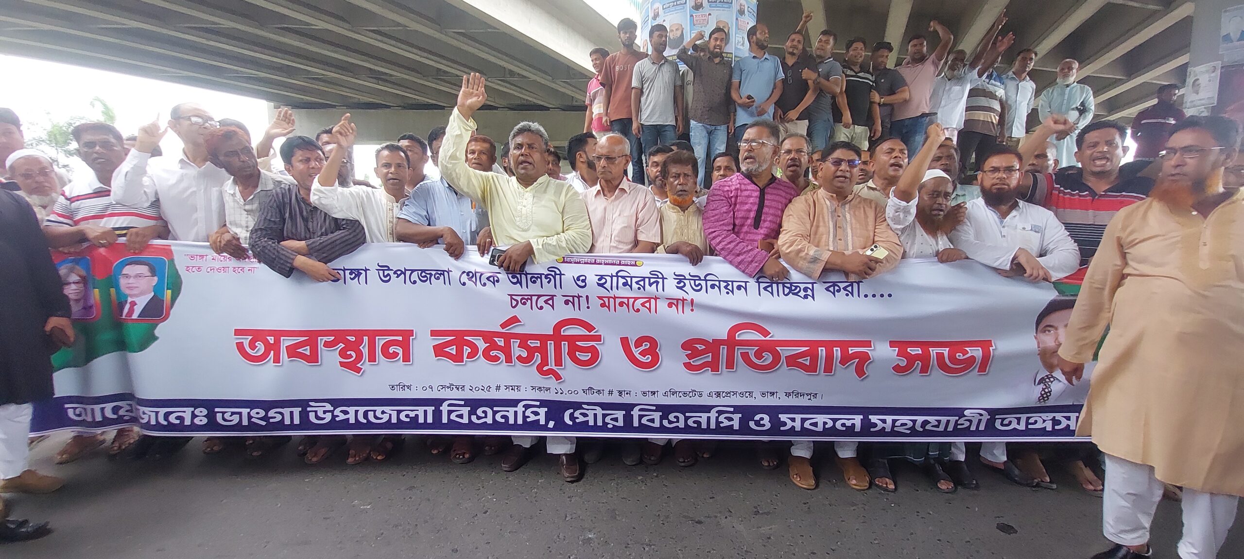 ভাঙ্গা (ফরিদপুর) সংবাদদাতা-০৭/০৯/২০২৫ ফরিদপুর-৪ আসন থেকে ভাঙ্গার উপজেলার আলগী ও হামিরদী ইউনিয়নকে কেটে ফরিদপুর-২ আসনে অন্তর্ভুক্ত করার প্রতিবাদে ভাঙ্গা উপজেলা বিএনপি মানববন্ধন ও অবস্থান কর্মসূচি পালন করেছে। রোববার সকাল ১০ টা থেকে শুরু করে দুপুর ১২ টা পর্যন্ত ভাঙ্গা হাইওয়ে এক্সপ্রেসের ইন্টারচেঞ্জ ফ্লাইওভারের নিচে উক্ত কর্মসূচি পালিত হয়। ভাঙ্গা উপজেলা বিএনপির সভাপতি হাজী ইকবাল হোসেন সেলিমের সভাপতিত্বে কর্মসূচিতে আরো বক্তব্য রাখেন ভাঙ্গা উপজেলার বিএনপির সাধারণ সম্পাদক আইয়ুব মোল্লা। তিনি বলেন, ফরিদপুর-৪ আসনের ভাঙ্গা উপজেলার যে দুটি ইউনিয়নকে কর্তন করে পার্শ্ববর্তী ফরিদপুর-২ আসনে অন্তর্ভুক্ত করা হয়েছে তা অনতিবিলম্বে প্রত্যাহার করে ফরিদপুর-৪ এর সীমানা অটুট রাখার জন্য নির্বাচন কমিশনের প্রতি আহ্বান জানিয়েছেন। বাংলাদেশের মডেল ভাঙ্গা উপজেলার অঙ্গ ছেদ করে শান্ত পরিবেশকে অশান্ত না করারও জোর দাবি জানানো হয়।