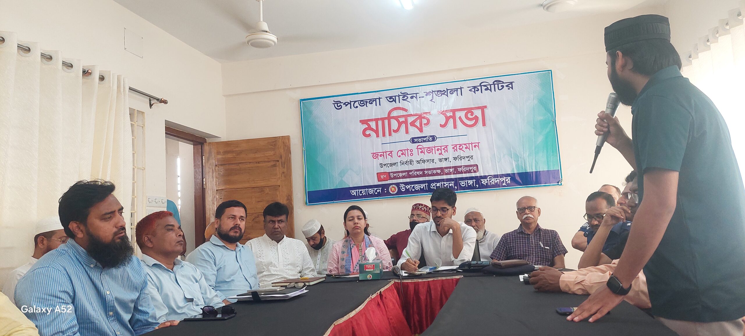 ফরিদপুরের ভাঙ্গা উপজেলা প্রশাসনের উদ্যোগে আইন-শৃঙ্খলা বিষয়ক মাসিক সভা অনুষ্ঠিত হয়েছে। সোমবার দুপুরে উপজেলা পরিষদের হলরুমে আয়োজিত অনুষ্ঠানে সভাপতিত্ব করেন উপজেলা নির্বাহী কর্মকর্তা মিজানুর রহমান। সভায় ঈদুল ফিতরকে সামনে রেখে ভাঙ্গায় আইন-শৃঙ্খলার কোন ধরনের অবনতি না ঘটে এবং নির্বিঘ্নে মানুষ তাদের ঈদ মার্কেটিং সহ যাবতীয় কর্মকাণ্ড পরিচালিত করতে পারেন সে সব বিষয়ের উপর ব্যাপক আলোচনা হয়। সভায় আরো উপস্থিত ছিলেন উপজেলা সহকারী কমিশনার ভূমি মেশকাতুল জান্নাত রাবেয়া। থানার ভারপ্রাপ্ত কর্মকর্তা আশরাফ উদ্দিন, হাইওয়ে থানার ভারপ্রাপ্ত কর্মকর্তা রাকিবুদ্দিন, ভাঙ্গা প্রেসক্লাবের সভাপতি গোলাম কিবরিয়া বিশ্বাস, সাধারণ সম্পাদক মুজিবর মুন্সি, বিভিন্ন দপ্তরের প্রধান গন, বিভিন্ন ইউনিয়ন পরিষদের চেয়ারম্যান গন, রাজনৈতিক ব্যক্তিত্ব সহ আলেম সমাজের লোকজন।