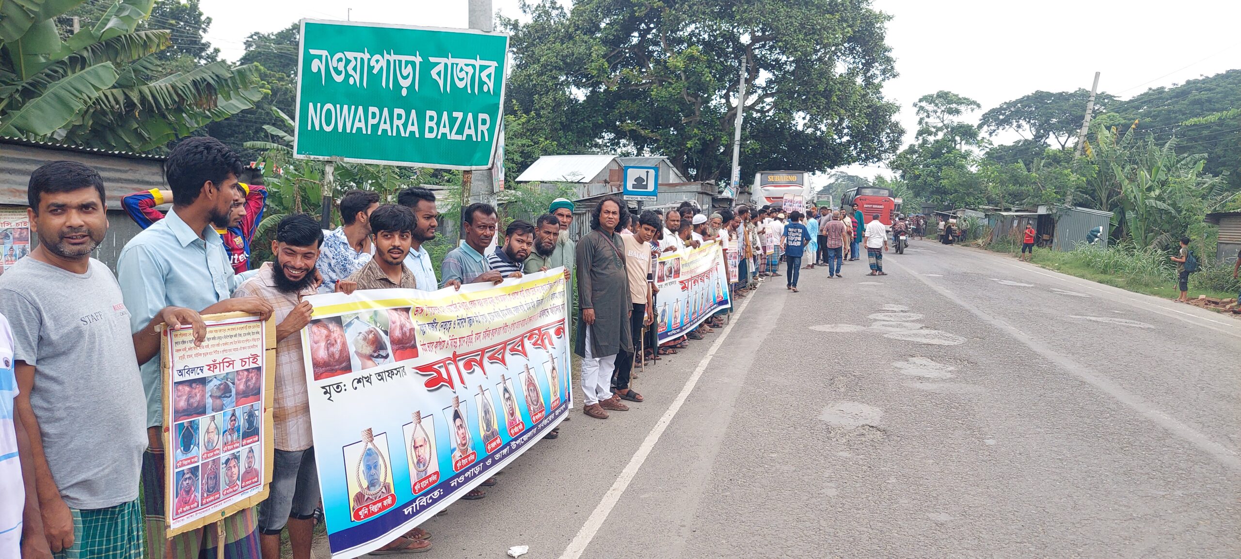 ফরিদপুরের ভাঙ্গায় আলোচিত আফসার শেখ হত্যার বিচার দাবিতে মানববন্ধন ও বিক্ষোভ মিছিল করেছে গ্রামবাসী। রোববার সকাল ১০টায় ফরিদপুর বরিশাল মহাসড়কের নওপড়া বাজার বাসষ্টান্ডে ঘন্টা ব্যাপী এ মনববন্ধন ও বিক্ষোভ কর্মসূচি পালন করে এলাকাবাসী ও ভুক্তোভোগী পরিবারের সদস্যরা।