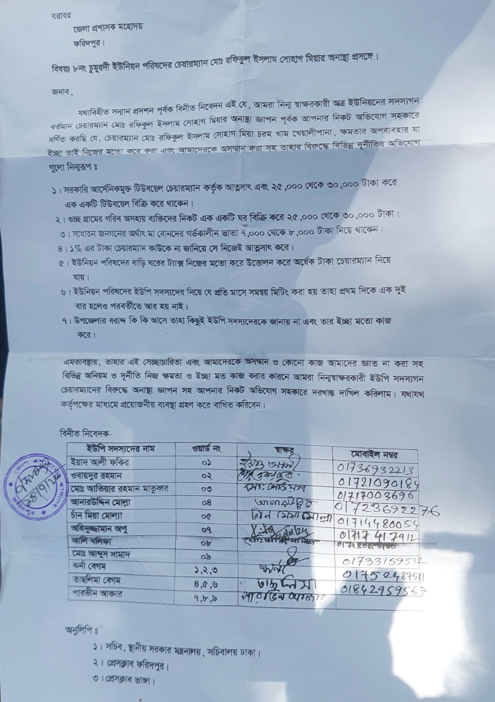 ভাঙ্গা(ফরিদপুর) সংবাদদাতা-১৮/০৭/২০২৫ ফরিদপুরের ভাঙ্গা উপজেলার চুমুরদী ইউনিয়ন পরিষদের চেয়ারম্যান মোঃ রফিকুল ইসলাম সোহাগের বিরুদ্ধে তার নানা অনিয়ম ও স্বেচ্ছাচারিতার দায়ে ইউপি সদস্যরা অনাস্থা দিয়েছে।চুমুরদী ইউনিয়নের ১২ জন ইউপি সদস্য তার প্রতি অনাস্থা প্রস্তাব গ্রহণ করে ভাঙ্গা উপজেলা নির্বাহী কর্মকর্তা ও ফরিদপুর জেলা প্রশাসক সহ সংশ্লিষ্ট কর্তৃপক্ষের নিকট স্মারকলিপি প্রদান করেন। ইউপি চেয়ারম্যানের দ্রুত অপসারণের দাবীতে শুক্রবার সকালে চুমুরদী ইউনিয়ন পরিষদ চত্বরে ইউপি সদস্যগন, ভুক্তভোগী কয়েক নারী ও এলাকাবাসী এক প্রতিবাদ, বিক্ষোভ মিছিল ও অবস্থান কর্মসূচি পালন করে। এসময় ইউপি পরিষদ চত্বরে ভুক্তভোগী নারী পুরুষ সহ ইউপি সদস্যরা জড় হয়ে তার বিরুদ্ধে নানা অভিযোগ তুলে শ্লোগান দিতে থাকে।
