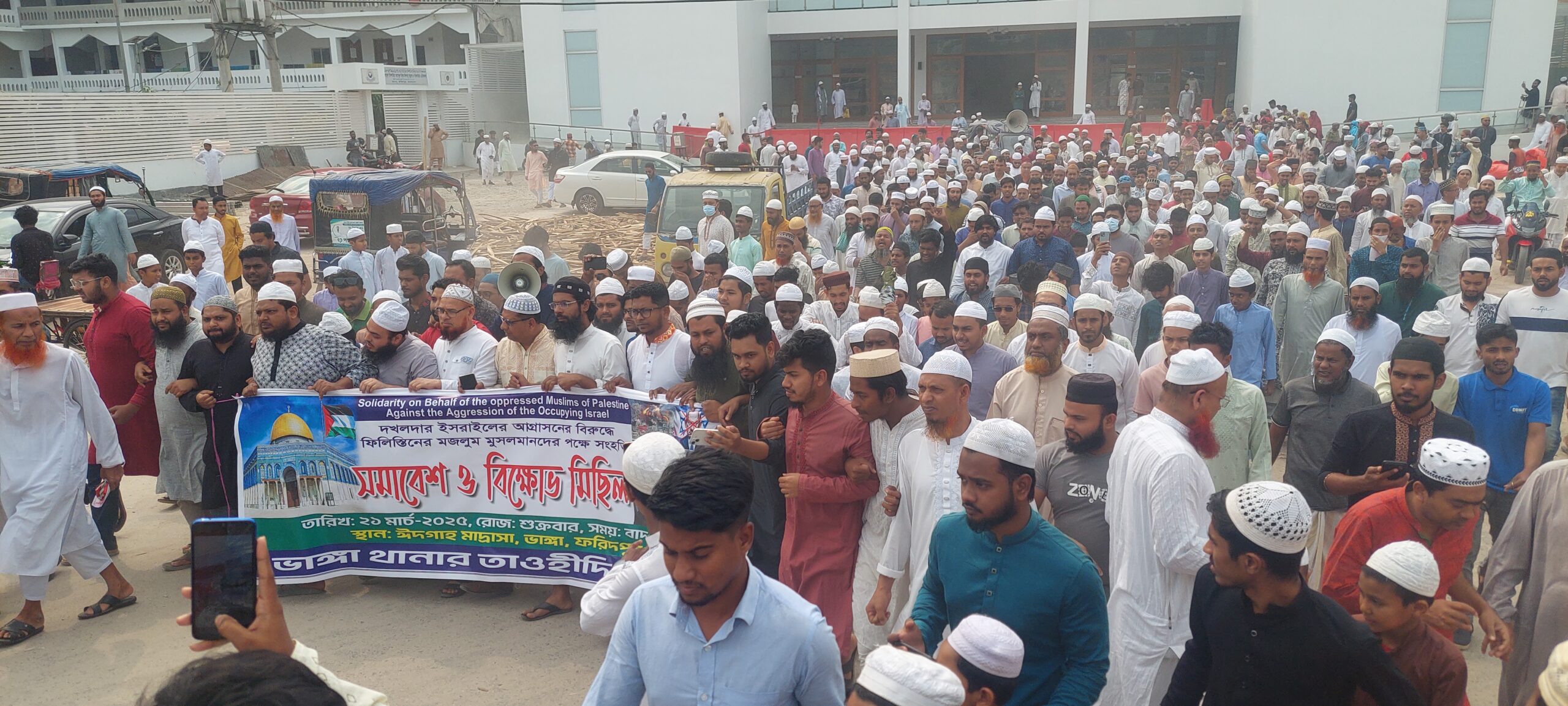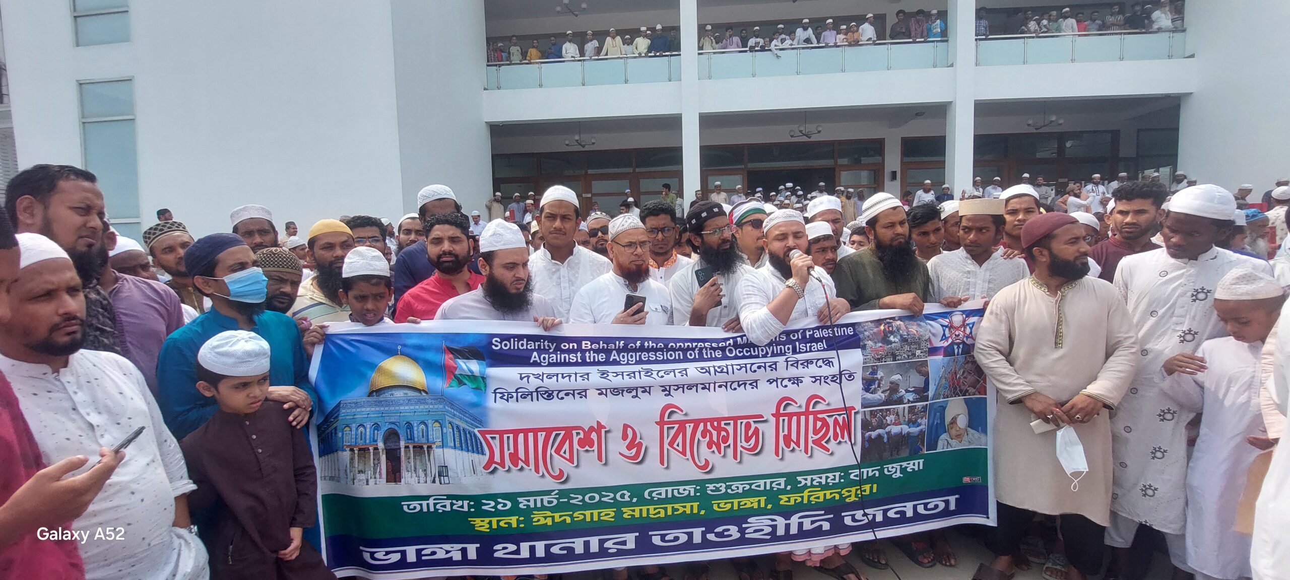 ফরিদপুরের ভাঙ্গায় শুক্রবার জুম্মার নামাজের পর ইসরাইলের আগ্ৰাসনের বিরুদ্ধে মুসল্লিদের বিক্ষোভ মিছিল হয়েছে। নিরীহ ফিলিস্তিনিদের উপর ইসরাইলের বর্বরোচিত হামলার প্রতিবাদে মিছিলটি ভাঙ্গা ঈদগাহ মাদ্রাসা থেকে শুরু করে শহর প্রদক্ষিণ করে। মিছিলে হাজারো মুসল্লিদের শ্লোগানে প্রকম্পিত হয়ে উঠে ভাঙ্গা শহর। মিছিল থেকে অনতিবিলম্বে যুদ্ধ বিরতি ও ইসরাইলের আগ্ৰাসনের বন্ধর দাবি জানানো হয়। হাজারো মুসল্লিদের পাশাপাশি মিছিলে অংশগ্রহণ করেন, ঈদগাহ মাদ্রাসার মুহতামিম মাওলানা তল্লহা। বৈষম্য বিরোধী ছাত্র আন্দোলনের নেতা ওসমান গনি আকাশ, বিএনপি নেতা সাঈদ মুন্সি, বিটু মুন্সি, শাওন মুন্সি ও ভাঙ্গা বাজারের ব্যবসায়ী গন প্রমুখ।