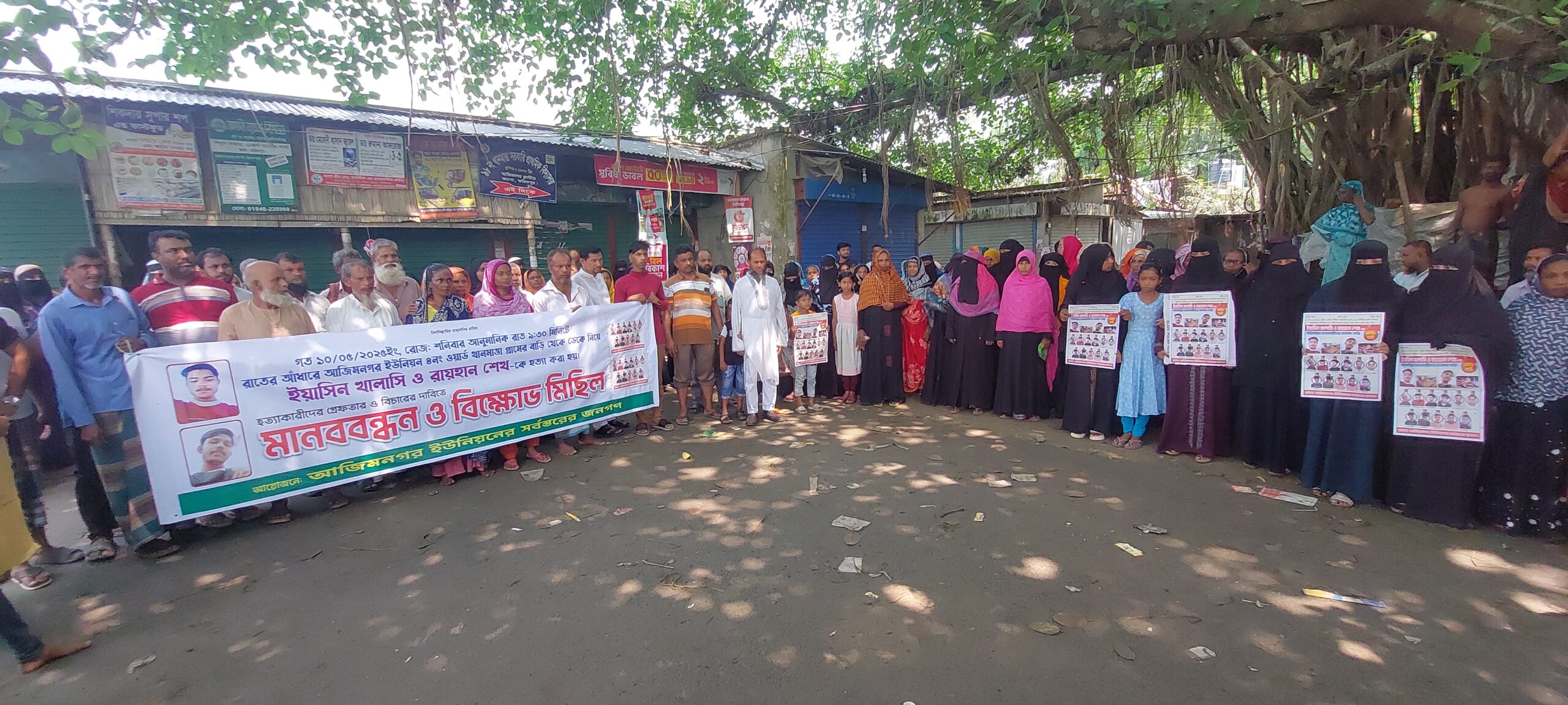 শতশত গ্ৰামবাসি হাতে হাত রেখে বাজারের সড়কে দাঁড়িয়ে হত্যাকারীদের গ্রেফতার ও বিচারের দাবিতে বিভিন্ন শ্লোগান দিতে থাকে। মানববন্ধন শেষে একটি মিছিল থানমাত্তা বাজার থেকে শুরু করে শিমুল বাজার হয়ে থানমাত্তা গ্ৰামে এসে শেষ হয়। মানববন্ধন ও বিক্ষোভ মিছিলটি আজিমনগর ইউনিয়ন পরিষদের চেয়ারম্যান শাজাহান হাওলাদারের নেতৃত্বে নিহত পরিবারের সদস্যরা ও কয়েক গ্ৰামবাসী অংশ গ্ৰহন করে।
