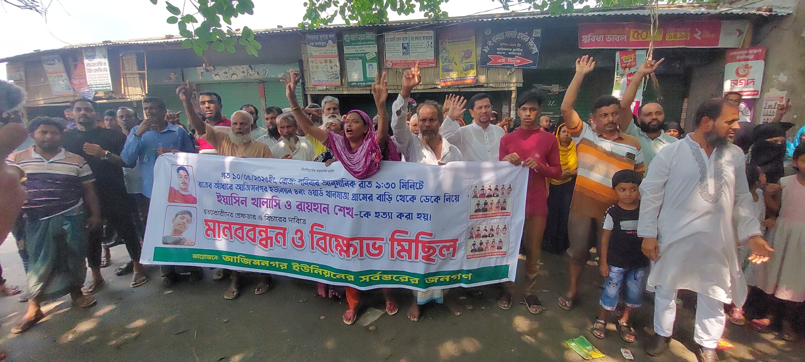 ফরিদপুরের ভাঙ্গায় চাঞ্চল্যকর ২ যুবকে কুপিয়ে হত্যার ঘটনায় হত্যাকারীদের বিচার দাবিতে মানববন্ধন ও বিক্ষোভ মিছিল করেছে গ্ৰামবাসী । শুক্রবার বেলা ১০ টার সময় ভাঙ্গা উপজেলার আজিমনগর ইউনিয়নের থানমাত্তা বটতলা বাজারে মানববন্ধন ও বিক্ষোভ মিছিল অনুষ্ঠিত হয়। মানববন্ধন ও বিক্ষোভ মিছিলের নিরাপত্তায় ঘটনাস্থলে সার্বক্ষণিক উপস্থিত ছিলেন পুলিশের উর্ধ্বতন কর্মকর্তারা।