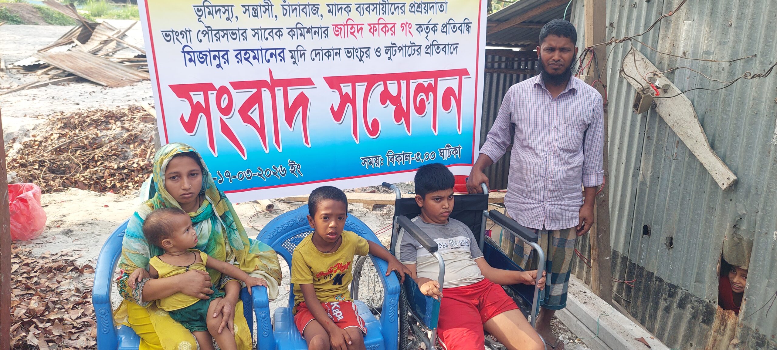 ফরিদপুরের ভাঙ্গায় পৌরসভার এক সাবেক কাউন্সিলরের বিরুদ্ধে এক প্রতিবন্ধী পরিবারের বসতঘর দখল, ভাঙচুর ও মুদি দোকানের মালপত্র লুটপাটের অভিযোগ পাওয়া গেছে। মঙ্গলবার বিকেলে পৌর সভার কৈডুবী সদরদী বাস স্ট্যান্ড সংলগ্ন স্থানে এ ঘটনা ঘটে । পরবর্তীতে ভুক্তভোগী প্রতিবন্ধী পিতা মিজানুর রহমান ও তার প্রতিবন্ধী ২ সন্তানকে সাথে নিয়ে অপরাধীদের দৃষ্টান্তমূলক শাস্তি দাবি করে সংবাদ সম্মেলন করেছেন। এ ঘটনায় ভাঙ্গা থানায় একটি লিখিত অভিযোগ দায়ের করেছেন চৌধুরীকান্দা সদরদীর বাসিন্দা আব্দুল কুদ্দুস মোল্যার ছেলে ভুক্তভোগী মোঃ মিজানুর রহমান।