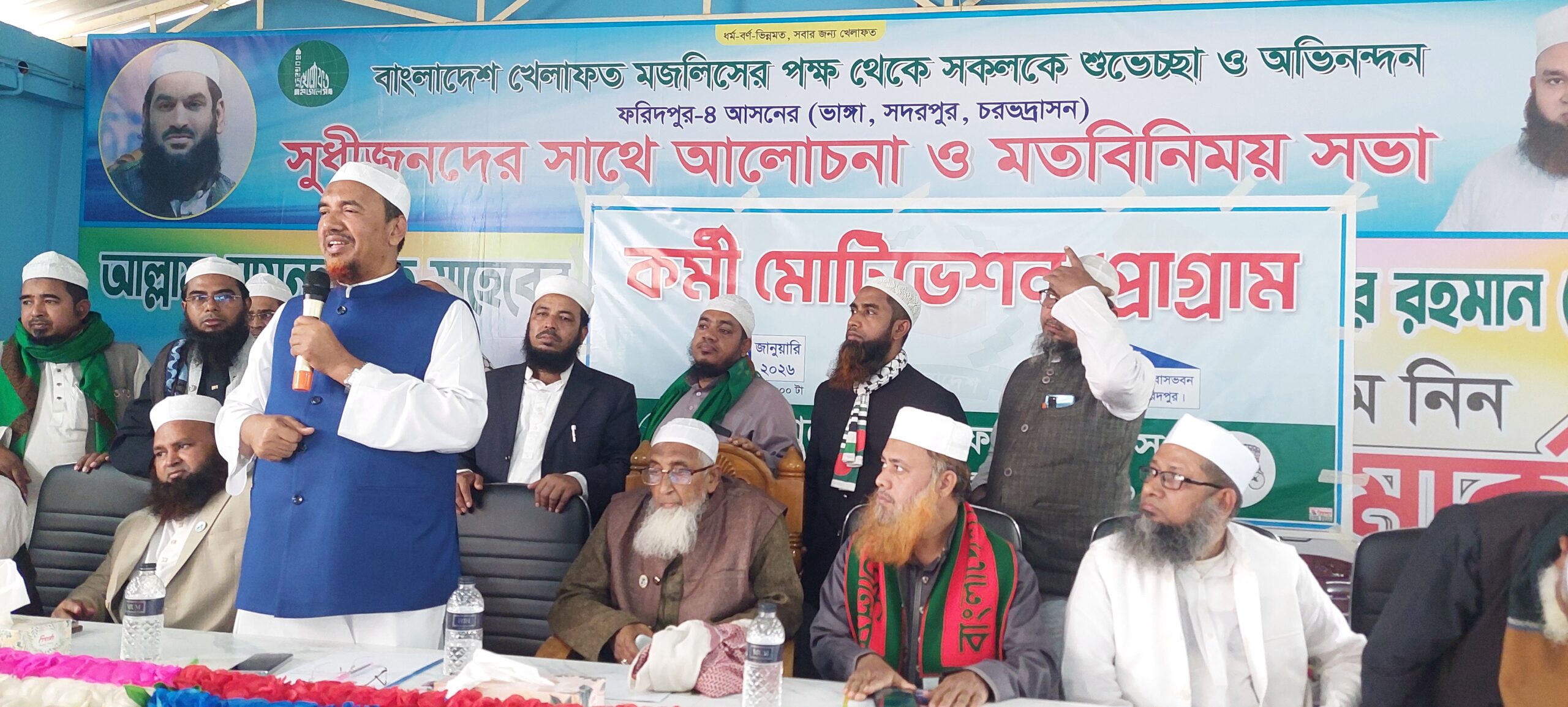 আসন্ন ত্রয়োদশ জাতীয় সংসদ নির্বাচন উপলক্ষে ফরিদপুরের ভাঙ্গায় বাংলাদেশ খেলাফত মজলিসের ৪ জেলার এমপি প্রার্থীদের অংশগ্রহণে কর্মী মোটিভেশন প্রোগ্রাম অনুষ্ঠিত হয়েছে। মঙ্গলবার (২০ জানুয়ারী) সকালে ভাঙ্গা উপজেলার পুলিয়া বাসস্ট্যান্ড সংলগ্ন এলাকায় দিনব্যাপী চলা অনুষ্ঠানে যোগ দেন ফরিদপুর , মাদারীপুর, গোপালগঞ্জ ও শরীয়াতপুর জেলার বাংলাদেশ খেলাফত মজলিসের মনোনয়ন প্রাপ্ত প্রার্থী ও নেতাকর্মীরা। মোটিভেশন প্রোগ্রামে বক্তারা উপস্থিত দলীয় নেতা-কর্মীদের উদ্দেশে বলেন, এয়োদশ জাতীয় সংসদ নির্বাচনে এজেন্ট ও পর্যবেক্ষক গন সুশৃংখল ভাবে দায়িত্ব পালন করতে করনীয় দিক নিয়ে আলোচনা করেন।