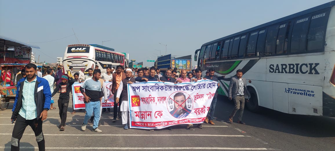 স্টাফ রিপোর্টার-১৫/১২/২০২৪ ফরিদপুরের ভাঙ্গায় বিএনপি অঙ্গ সংগঠন সেচ্ছাসেবক দলের ভাঙ্গা উপজেলার আহ্বায়ক সিকদার সাইদুর রহমান মিঠু ও যুবদল নেতা প্রিন্স সহ বৈষম্য বিরোধী সমন্বয়ক ওসমান গনি আকাশ সহ ৮-১০ জন নেতা কর্মীর নামে মিথ্যা সংবাদ প্রচারের প্রতিবাদে বিক্ষোভ মিছিল হয়েছে। সাংবাদিক আব্দুল মান্নান তার ফেসবুক আইডিতে ও দৈনিক যুগান্তরে মিথ্যা সংবাদ প্রচার করায় তাকে হলুদ সাংবাদিক আখ্যা দিয়ে তাকে অনতিবিলম্বে গ্রেফতারের দাবী জানিয়ে বিক্ষোভ মিছিল করেছে বৈষম্য বিরোধী সমন্বয়ক সহ বিএনপি’র শত শত নেতা কর্মী। রোববার সকালে ভাঙ্গা ঈদগাহ মসজিদ থেকে ব্যানার হাতে বিভিন্ন স্লোগানে স্লোগানে একটি বিক্ষোভ মিছিল শুরু হয়। মিছিলটি ভাঙ্গা বিশ্বরোড মোড় হয়ে উপজেলা চত্বর দিয়ে ঘুরে বাজারপাড় থানার সামনে দিয়ে এসে ঈদগাহ মাদ্রাসায় এসে শেষ হয়। মিছিল শেষে উপজেলা স্বেচ্ছাসেবক দলের আহ্বায়ক সিকদার সাইদুর রহমান মিঠু বলেন, ভাঙ্গাতে সার্বিক পরিবহনের কোন কাউন্টার নেই অথচ সাংবাদিক মান্নান সংবাদে লিখেছে বৈষম্য বিরোধী নেতা ও বিএনপি নেতা মিলে সার্বিক পরিবহনের কাউন্টার দখলের চেষ্টা করেছে। আমরা সেদিন আমাদের এক নিকট আত্মীয়কে সার্বিক পরিবহনে তুলে দিতে চেকারের কাছে গিয়েছিলাম। সেখানে চেকারের সাথে আমাদের মতের অমিল হলে কথা কাটাকাটি ও ধাক্কাধাক্কি হয় মাত্র। এটাকে পুঁজি করে সাংবাদিক মান্নান আওয়ামী লীগের দালাল আমাদের বিরুদ্ধে মিথ্যা সংবাদ প্রচার করে। সাংবাদিক মান্নান আওয়ামী লীগের প্রেসিডিয়াম সদস্য কাজী জাফরউল্লাহর খুবই ঘনিষ্ঠজন। ৫ আগষ্টের পট পরিবর্তনের সুযোগে ভাঙ্গা থানার ও উপজেলা প্রশাসনের কর্মকর্তাদের ব্যবহার করে সম্প্রতি বীর মুক্তিযোদ্ধা গিয়াস উদ্দিনের জায়গা দখল করে বহুতল ভবন নির্মাণ করিতেছে। মান্নান প্রশাসনকে ব্যবহার করে অসহায় পরিবারগুলোকে জিম্মি করে এবং তাদের বিরুদ্ধে বিভিন্ন মিথ্যা মামলা দিয়ে তাদেরকে জেল হাজতে ঢুকিয়ে রেখেছে। একই সাথে সাংবাদিকের নাম ব্যবহার করে প্রতি অটো গাড়ি থেকে মাসিক ৩ হাজার টাকা করে তুলে সে। তার সাংবাদিকের ভিজিটিং কার্ডের পিছনে সিল দিয়ে সাক্ষর করে এইসব টাকা দীর্ঘদিন যাবত সে উত্তোলন করে আসছে। থানা প্রশাসনকে উল্টোপাল্টা বুঝিয়ে গ্রেফতার বাণিজ্য করার অভিযোগ রয়েছে তার বিরুদ্ধে। সে নিজেই একাধিকবার জেল খাটা অপরাধী। মানব পাচার, মানি লন্ডারিং গুম সহ একাধিক মামলা রয়েছে তার বিরুদ্ধে। বিভিন্ন থানায় একাধিক মামলা থাকায় পুলিশ ও কোট কাচারির সাথে তার সখ্যতা রয়েছে। সুযোগ সন্ধানী মান্নান নিজের অপকর্মকে সাংবাদিকের ব্যানার দিয়ে সব সময় ধামাচাপা দেয়। আমরা এসব বিষয়ে প্রতিবাদ করাতে আমাদের উপর বেশ কয়েকদিন আগে থে