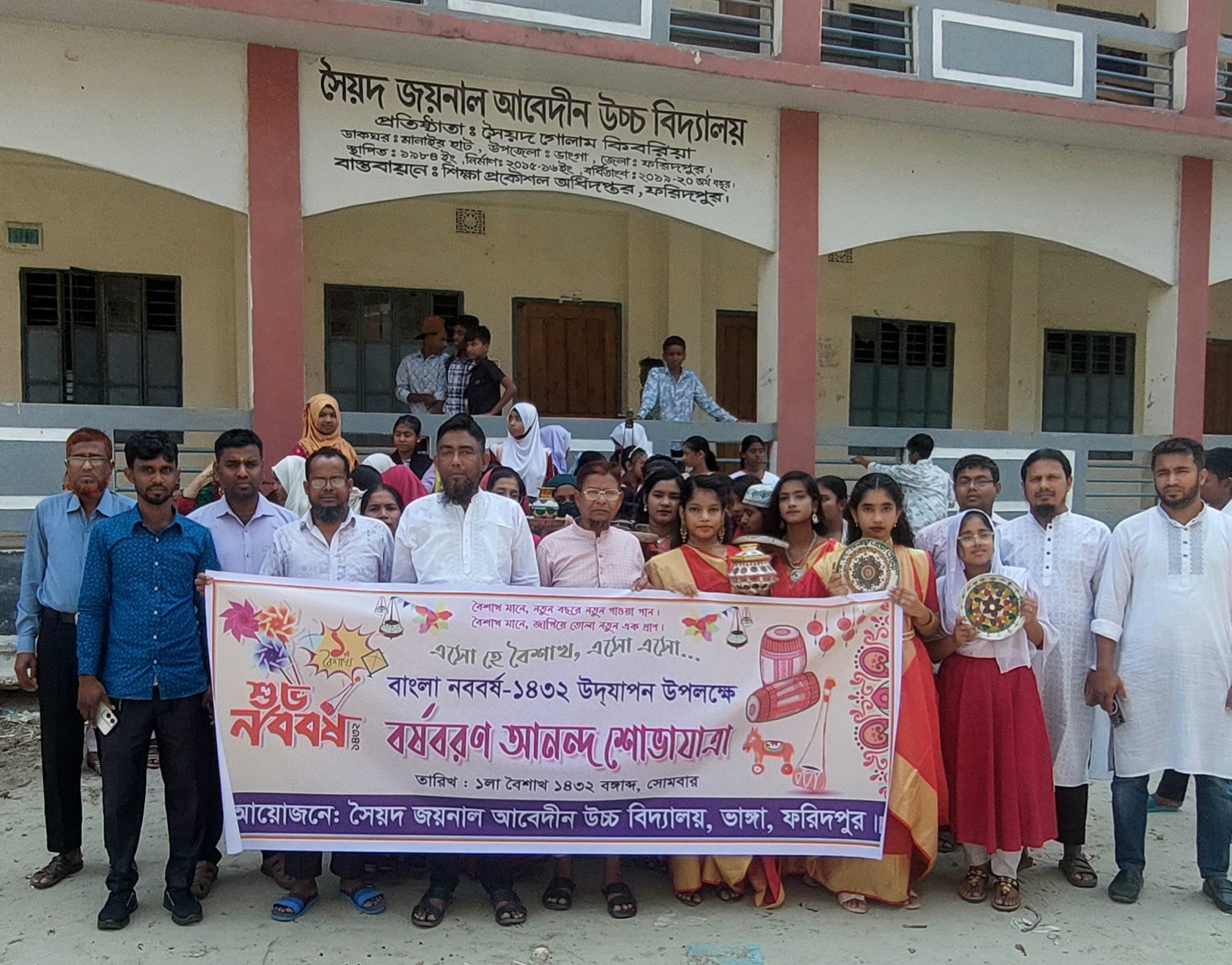 বাংলা নববর্ষ ১৪৩২ কে বর্ণাঢ্য আয়োজনে বরণ করে নিয়েছে ফরিদপুরের ভাঙ্গা উপজেলার বিভিন্ন শিক্ষা প্রতিষ্ঠান। এ উপলক্ষে সকাল থেকেই সরকারি প্রাথমিক বিদ্যালয়, মাধ্যমিক বিদ্যালয় ও কলেজ সমুহ নিজ নিজ প্রতিষ্ঠানের কবিতা আবৃত্তি, চিত্রাঙ্কন, যেমন খুশি সাজো সহ বনার্ঢ্য র্যালির আয়োজন করা হয়। এতে শিক্ষক শিক্ষার্থী সহ অভিভাবকদের অংশ গ্ৰহন করতে দেখা যায়। ভাঙ্গা সরকারি পাইলট উচ্চ বিদ্যালয়ের প্রধান শিক্ষক হায়দার হোসেন বলেন, প্রশাসনের সার্বিক সহযোগিতা ও দলমত নির্বিশেষে মনের আনন্দে সকলেই মিলেমিশে উৎসব মুখর পরিবেশে ১৪৩২ বাংলা বর্ষবরণ করতে পেরেছি। সৈয়দ জয়নাল আবেদিন উচ্চ বিদ্যালয়ের প্রধান শিক্ষক সরোয়ার হোসেন জানান, এবারের বর্ষবরণে সকলের উপস্থিতি অনুষ্ঠানকে প্রাণবন্ত করে তুলেছে। আব্দুর রশিদ মিয়া উচ্চ বিদ্যালয়ের প্রধান শিক্ষক মেজবাহা উদ্দিন বলেন, বর্ষবরণের দিন আবহাওয়া অনুকূলে থাকায় সকলের উপস্থিতি অনেকাংশে বেশি হওয়াতে সমগ্ৰ শিক্ষা প্রতিষ্ঠানে একটা হৈ হুল্লোড়ে মুখোরিত ছিল। শরীফাবাদ হাইস্কুল এন্ড কলেজের প্রধান শিক্ষক সাখাওয়াত হোসেন জানান, অতীতের গ্লানি ভুলে এবারের বর্ষবরণ অনুষ্ঠানে দল মত নির্বিশেষে সকলের মনে আলাদা একটা আনন্দ অনুভব করতে পেরেছে। পুলিয়া উচ্চ বিদ্যালয়ের প্রধান শিক্ষক বাচ্চু মাতুব্বর বলেন, অন্যরকম আয়োজনে এবারের বর্ষবরণ পালন করতে পেরে আমি সহ আমার প্রতিষ্ঠানের সকল শিক্ষক শিক্ষার্থী ও অভিভাবকদের মাঝে আনন্দ বিরাজ করছে।