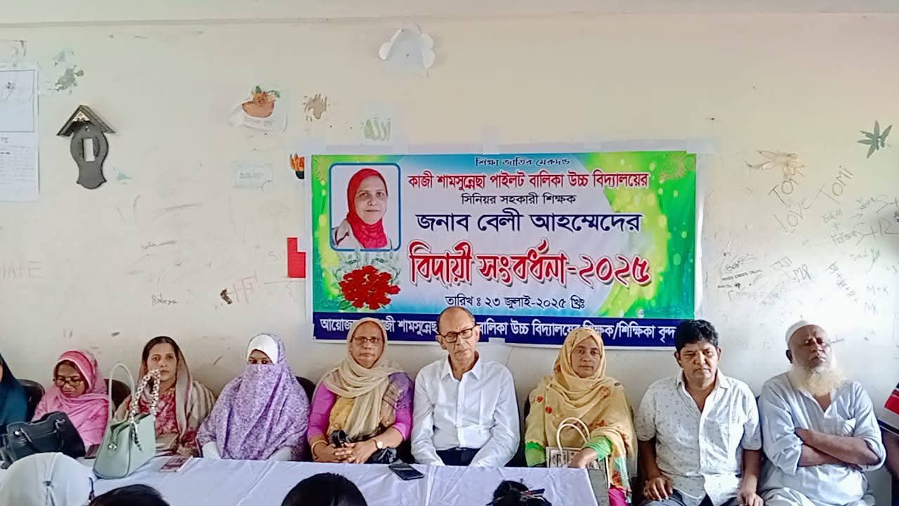 ফরিদপুরের ভাঙ্গায় ঐতিহ্যবাহী বিদ্যাপীঠ কাজী শামসুন্নেছা পাইলট বালিকা উচ্চ বিদ্যালয়ের সিনিয়র সহকারী শিক্ষিকা বেলী আহমেদকে অবসরজনিত বিদায়ী সংবর্ধনা দেওয়া হয়েছে। বুধবার (২৩শে জুলাই) সকালে তাকে বিদ্যালয়ের পক্ষ থেকে শিক্ষক-শিক্ষার্থীরা সংবর্ধনার আয়োজন করা হয়। চাকুরি জীবনে তিনি প্রায় ৩১ বছর একই বিদ্যালয়ে কর্মরত ছিলেন। প্রধান শিক্ষক অরুণ চন্দ্র দত্তের সভাপতিত্বে ও মনিরুজ্জামান মুন্সির সঞ্চালনায় অনুষ্ঠানে উপস্থিত ছিলেন বিদ্যালয় এর শিক্ষক শিক্ষিকা সহ সকল শ্রেণীর শিক্ষার্থীরা। অনুষ্ঠানে বক্তব্য রাখেন বিদ্যালয়ের প্রধান শিক্ষক অরুণ চন্দ্র দত্ত, বিশিষ্ট সমাজ সেবক রাজনৈতিক ব্যক্তিত্ব সাংবাদিক ওবায়দুল আলম সম্রাট,অবসর প্রাপ্ত সিনিয়র শিক্ষিকা বেলী আহমেদ, সিনিয়র শিক্ষক মোহাম্মদ জাকির হোসেন, চিন্তা হরন সাহা, মোঃ খালেদুর রহমান, আশিকুর রহমান,গুলশান আরা বেগম রুপালি ,মাই টিভি ভাঙ্গা উপজেলা প্রতিনিধি মোঃ সারোয়ার হোসেন, সাংবাদিক রিপন শেখ প্রমূখ। পরে বিদ্যালয়ের শিক্ষার্থী ও শিক্ষকদের পক্ষ থেকে বিদায়ী শিক্ষক বেলী আহমেদের হাতে বিভিন্ন ধরনের পুরস্কার তুলে দেওয়া হয়।