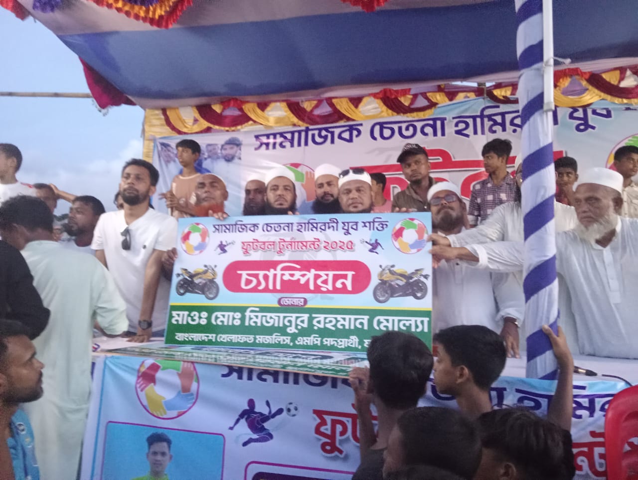 বাংলাদেশ খেলাফত মজলিস ফরিদপুর জেলা শাখার সহ সভাপতি ও ফরিদপুর-৪ আসনের সংসদ সদস্য পদপ্রার্থী মাওলানা মিজানুর রহমান মোল্লা এর পক্ষ থেকে চ্যাম্পিয়ন দলকে একটি মটর সাইকেল ও রানার আপ দলকে একটি ফ্রিজ পুরস্কার দেওয়া হয়।